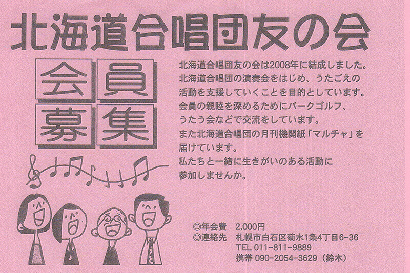 また、北海道合唱団の月間機関紙「マルチャ」を届けています。 私たちと一緒に生きがいのある活動に参加しませんか?